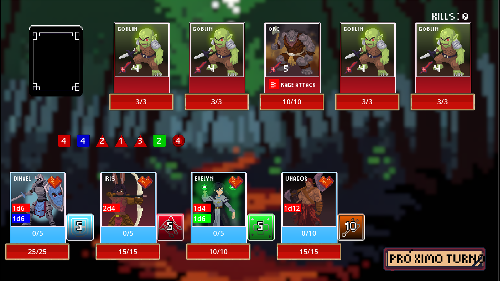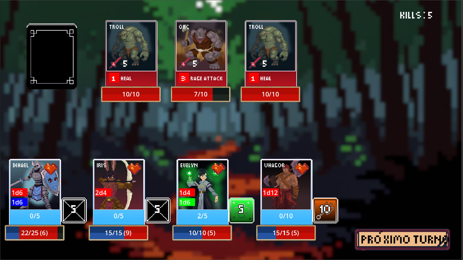 Enfrente combates taticos em turnos contra hordas de criaturas cada vez mais fortes. Combinando estrategia e sorte, escolha suas cartas com sabedoria e role os dados do destino.